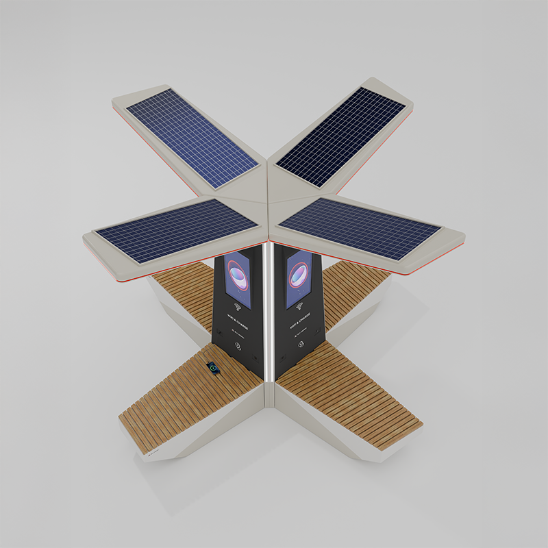 Geleneksel bank formunu yenilenebilir enerji ve akıllı şehir teknolojileriyle birleştiren çağdaş oturma çözümü.